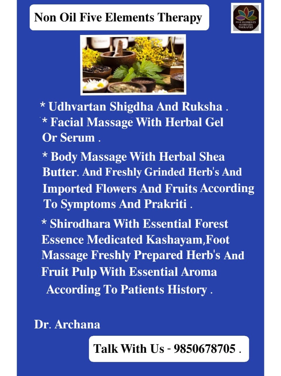 We, Five Elements Ayurveda, located at Gangurde Hospital,Gangapur Rd, behind Woodland Towers, Old Gangapur Naka, Shreerang Nagar, Nashik, Maharashtra 422013 is dedicated for providing non-surgical treatments for many ailments which can not be cured easily. We provide Ayurvedic care to patients of all age groups. It is our aim to treat as many people as we can by Ayurveda. We also provide Ayurvedic medicines according to the disease and disorders along with treatment which are made with precision and utmost care by professionals
